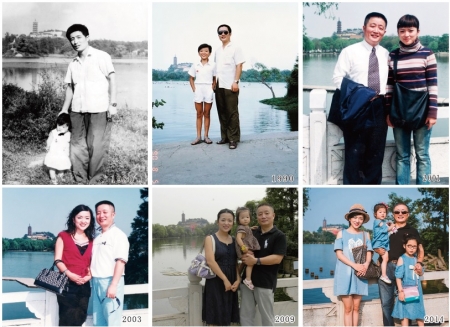就这样,两人年复一年地来到这里合影。拍照的人有时候是相识的亲朋,有时候是陌生的路人,有的时候则是华允庆自己设置自拍模式。1998年,华华作为交流生去了日本,因为学业繁重加上刚去几个月,她打电话给父亲:“今年我们的合影不能拍了。”华允庆心里一沉觉得挺遗憾。可转念一想,何不各自拍一张,再通过技术合成?结果,他让女儿在日本拍一张全身照寄回镇江,自己在塔影湖前那个固定的地点拍了一张单人照,最后将两张照片合在一起。