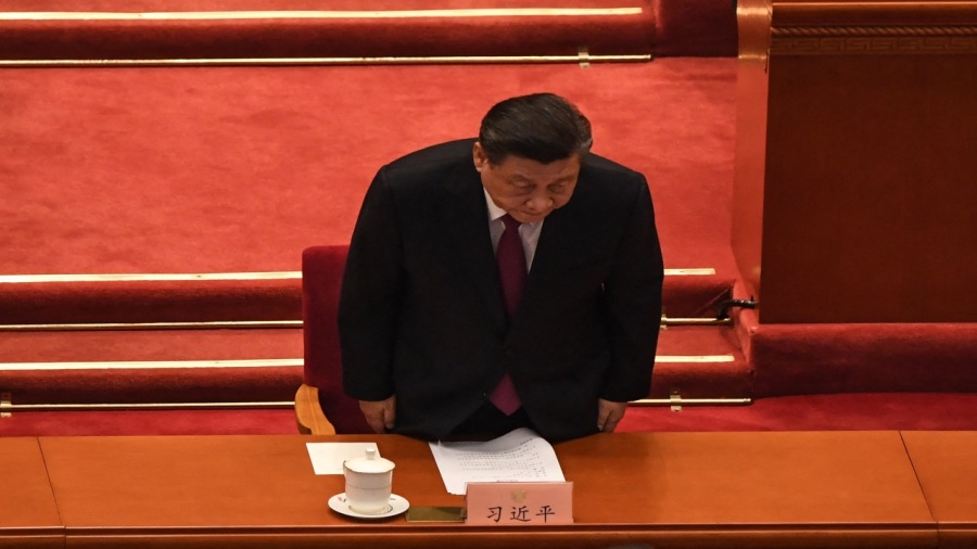 2021年3月1 日,中共党魁习近平在北京人民大会堂举行的中国人民 政治协商会议闭幕式上鞠躬致词。 (图片来源:NOEL CELIS/AFP via Getty Images)