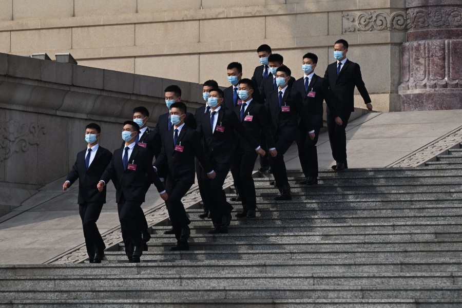 2024年3月10日,北京,中共政协会议闭幕式后,安保人员在人民 大会堂外行走。(图片来源:Getty Images)