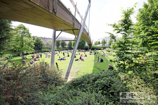 然后经过Daumesnil地铁站附近的热耶公园(Jardin de Reuilly)后,就进入高架部分,在高出地面近十米的空中凌驾于大街小巷之上。在这里人们可以坐在长凳上小憩,也可以在绿树花丛中漫步,一边欣赏两边各具特色的建筑,这里也是周围居民健身跑步的理想场所。