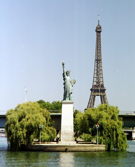 这座复制品出自纽约自由女神像原作作者法国雕塑家奥古斯特 "巴特勒迪(Auguste Bartholdi)之手,于1889年7月4日树立在塞纳河天鹅岛的西南端,天鹅小径的尽头,总统萨迪 "卡诺(Sadi Carnot)和雕塑家巴特勒迪参加了揭幕仪式。